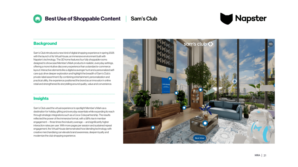 Sam’s Club earned the award for Best Use of Shoppable Content for creating an immersive virtual house that reimagines how members explore products online. Built with Napster’s technology, the 3D space lets shoppers browse hundreds of items staged in lifelike rooms and interact through features like a scavenger hunt and a self-care quiz.