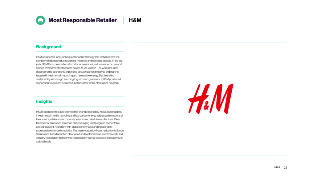 The retailer secured the award for Most Responsible Retailer for advancing a long-term sustainability strategy that reshapes how H&M designs products, sources materials and operates its global business. Over the past year, the brand deepened efforts to cut emissions, scale circular systems and strengthen social and environmental standards across its value chain, supported by investments in textile recycling, low-carbon technology and renewable energy.