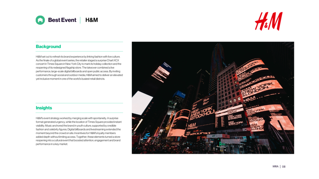 The first is for a global series that fused fashion and music, culminating in a surprise Charli XCX concert in Times Square. The takeover featured a livestreamed performance, massive digital billboards and the reopening of the brand’s redesigned flagship, drawing fans through day-of social announcements and member invitations.