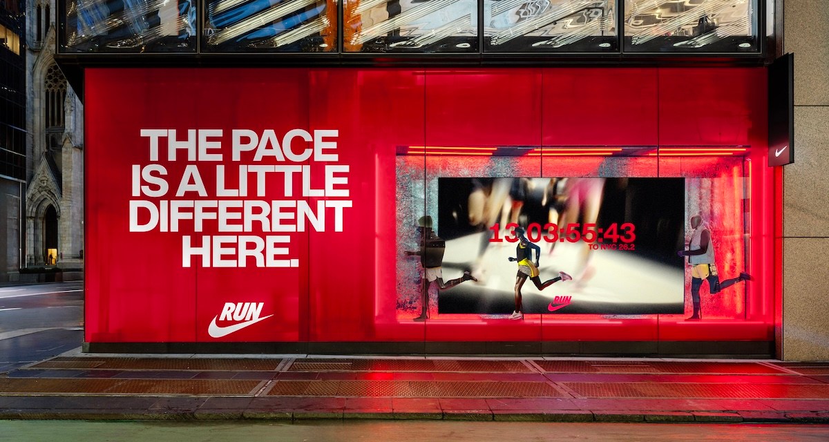 It’s a Friday morning in Manhattan, and construction workers are filing in and out of Nike’s 68,000-square-foot New York City flagship on Fifth Avenue. The building, one of Nike’s three House of Innovation stores, echoes with the sounds of clanging and drilling as Nike installs its latest running campaign on the ground level. An ode to the upcoming New York City Marathon, the floor is bathed in red light and shows off Nike athletic apparel and Vomero Premium shoes. Outside, on the street, text on the window reads, “The pace is a little different here.”