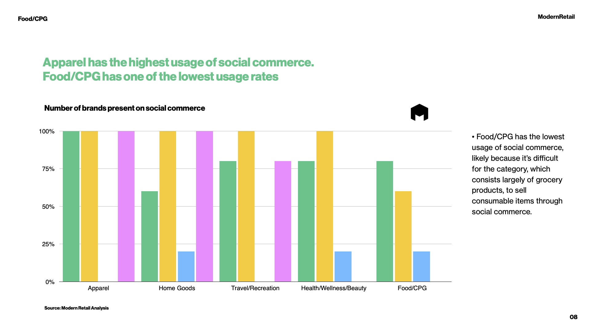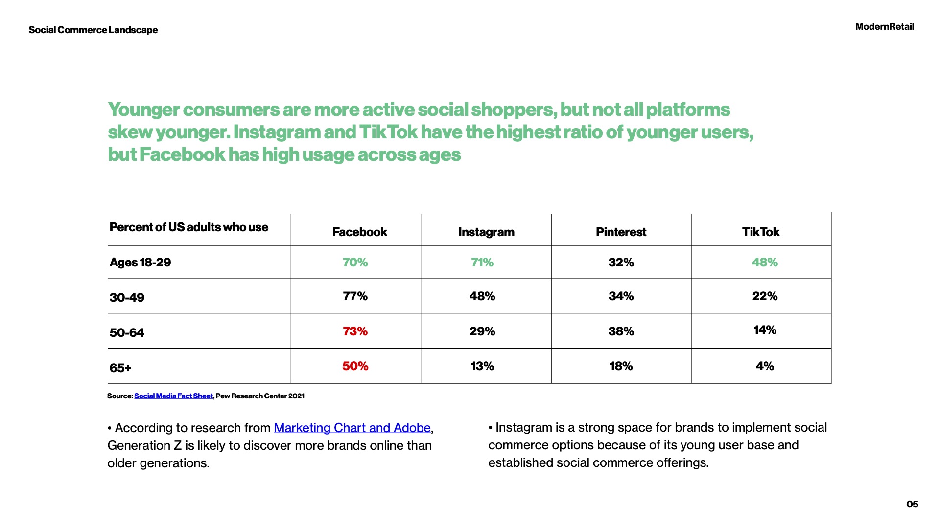 In the slides below, Modern Retail presents an overview of how five consumer-product categories are using social commerce across four leading social media platforms – Facebook, Instagram, Pinterest and TikTok. We also explore the platforms’ user demographics to determine where different generations are active and which platforms have the most potential for social-commerce growth. For a deeper, industry-level analysis of the social commerce landscape examined in the brief, read the full Modern Retail research report.